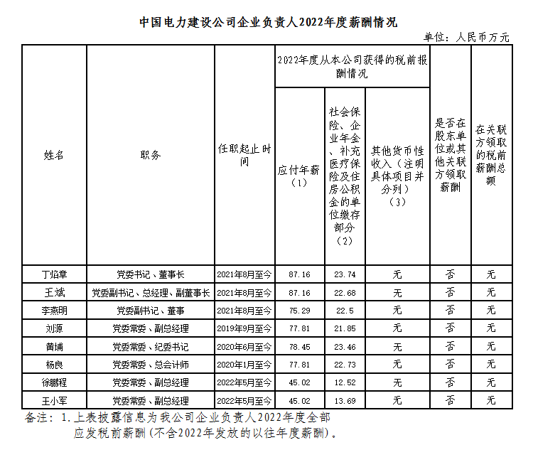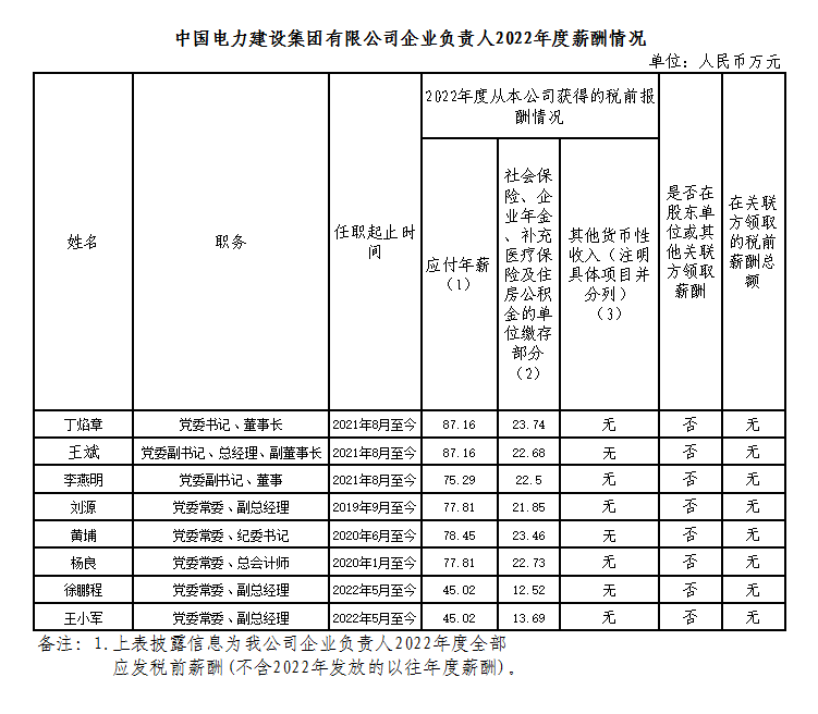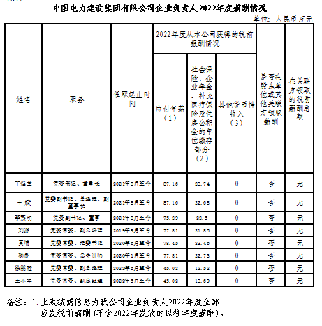 中國電力建設集團有限公司企業(yè)負責人2022年度薪酬情況